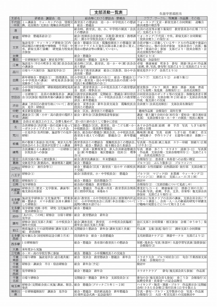 このページは全会員に各支部の活動について知っていただこうと考え企画したものです。各支部の皆様、支部だよりや活動写真など情報提供をいただければ幸いです。人権や個人情報などに配慮して掲載していきたいと考えます。
