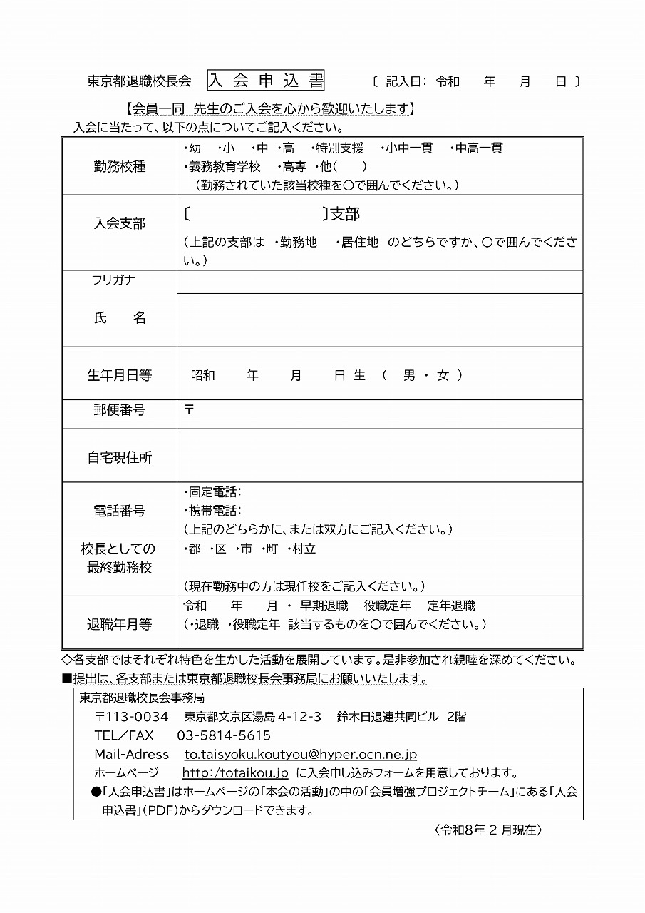 長会との信頼関係の構築が新入会員獲得の源となると思います。今年度三十一の支部総会にお招きいただき、会長として十四の支部に出席いたしました。そして、各支部が区市の教育委員会や現職校・園長会長を招いて、人間関係づくりを大切にしていることを実感いたしました。