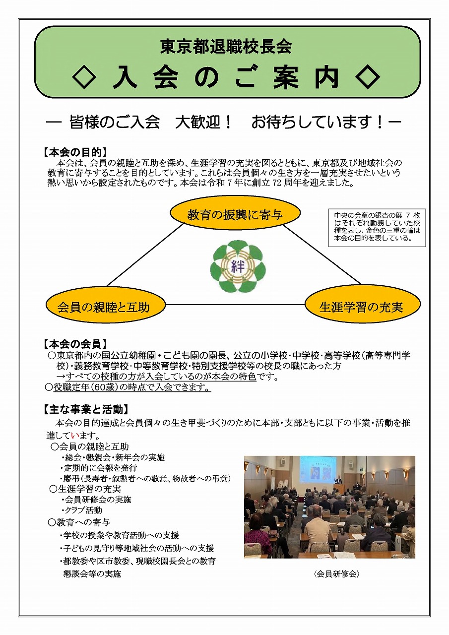 この三つのテーマは、都教委と現場の教員の双方に対する本会の応援の気持ちを込めて設定しました。教育懇談会を通して私達自身が都教委の進める教育についての理解を一層深めて、学校や地域の教育を支援していきたいと思います。